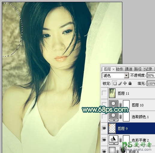 9、新建一个图层,图层混合模式改为“滤色”,不透明度改为:30%,把前景颜色设置为:#FEB720,用画笔把下图选区部分涂上高光。