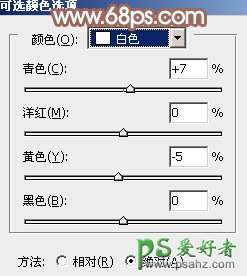 2、创建可选颜色调整图层,对黄、白、黑进行调整,参数设置如图2 - 4,效果如图5。这一步主要把图片中的淡黄色转为淡蓝色。