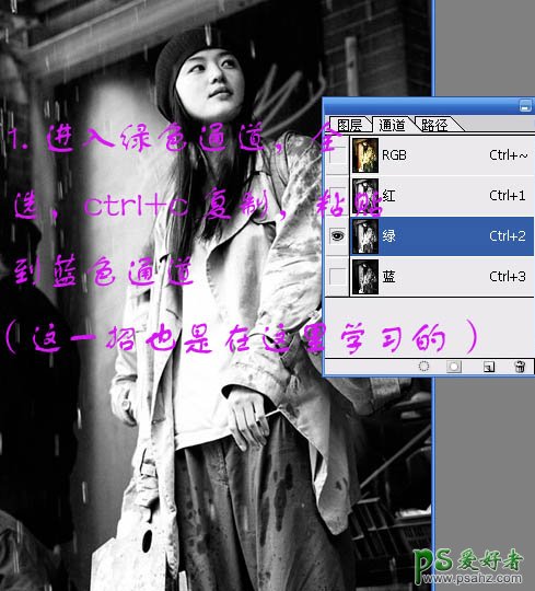 1、打开原图素材,把背景图层复制一层。进入通道面板,选择绿色通道按Ctrl + A 全选,按Ctrl + C 复制,选择蓝色通道按Ctrl + V 粘贴。