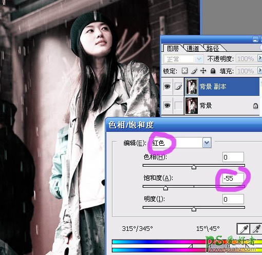 2、按Ctrl + U 调整色相/饱和度,对红色进行调整,适当降低饱和度,参数及效果如下图。