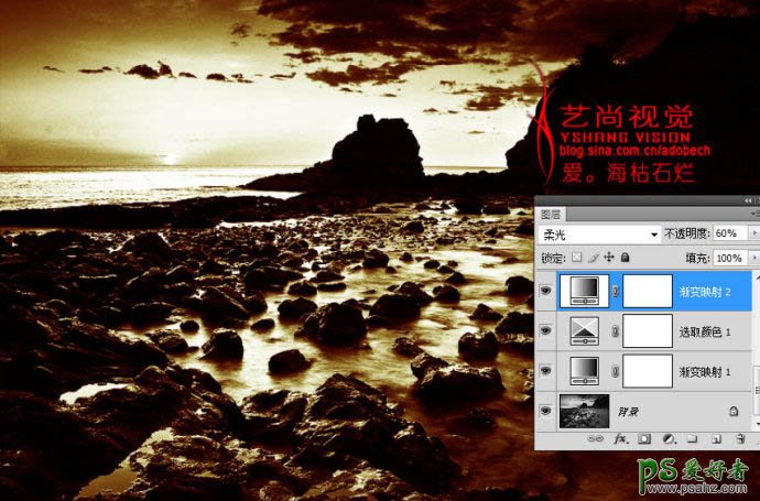 6、再次执行图层/创建新调整图层/渐变映射命令,颜色选择金黄色渐变,然后更改图层混合模式为柔光,不透明度为60%,如下图。