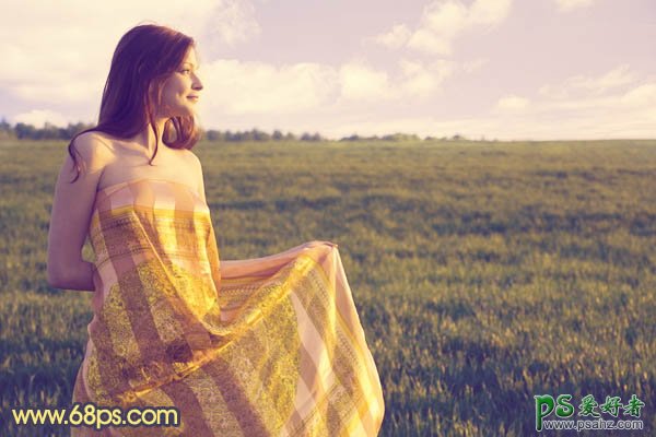 PS调色教程:给田野上的欧美少妇调出金色黄昏效果