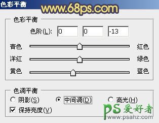 5、创建色彩平衡调整图层,对中间调进行调整,参数设置如图8,效果如图9。