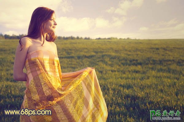PS调色教程:给田野上的欧美少妇调出金色黄昏效果