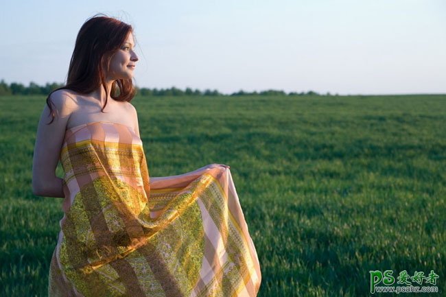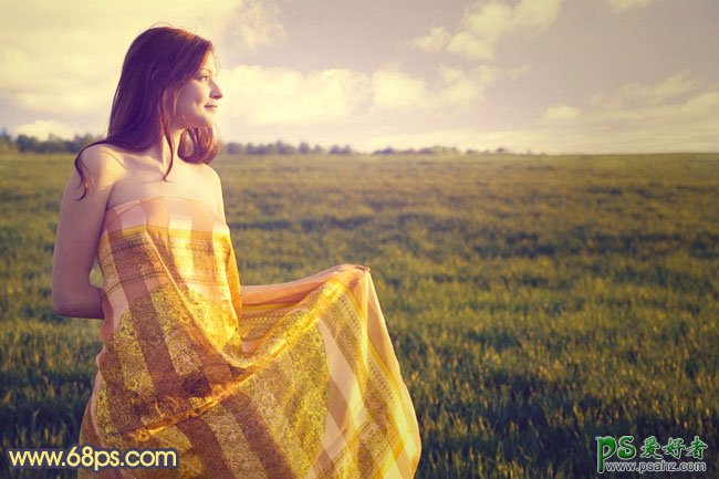 PS照片后期调色教程,PS调色教程:给田野上的欧美少妇调出金色黄昏效果,本教程介绍简单的黄昏色调色方法。大致过程:先用简单的美化一些图片,如给图片加上天空,人物部分适当磨皮等。然后用渐变映射调出大致的黄昏底色,再用调色工具适当加强色彩浓度及层次感即可。