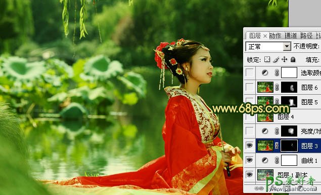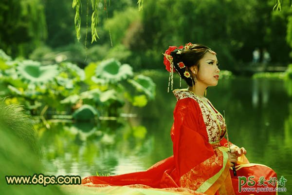 今天我们来学习一篇PS古装美女图片调色教程,PS调色教程:给古装美女图片调出个性暗绿色,本教程介绍暗调外景人物图片调色方法。大致过程:先把图片整体色调压暗,背景部分可以适当模糊处理,再适当用调色工具调出主色。然后把人物部分调亮即可。 最终效