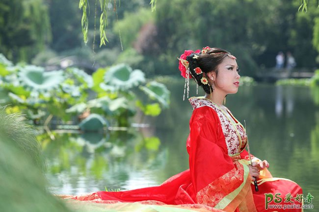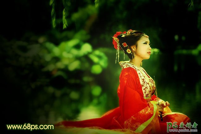 今天我们来学习一篇PS古装美女图片调色教程,PS调色教程:给古装美女图片调出个性暗绿色,本教程介绍暗调外景人物图片调色方法。大致过程:先把图片整体色调压暗,背景部分可以适当模糊处理,再适当用调色工具调出主色。然后把人物部分调亮即可。
