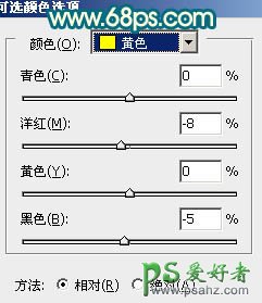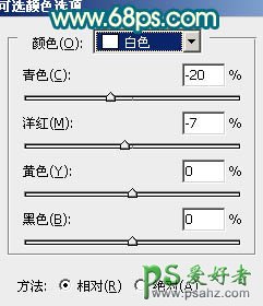 7、新建可选颜色调整图层,对黄,白进行调整,参数设置如图15,16,效果如图17。