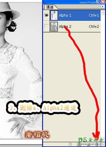 面板,用鼠标把a 通道拖到图层面板下面的删除按钮上删除,在弹出的对话框选择好,确定后在通道面板上会多出一个Alpha 2通道。