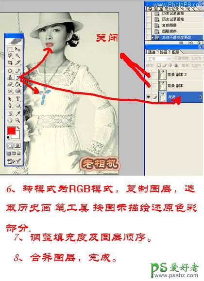 6、选择菜单:图像 > 模式 > RGB颜色,确定后把背景图层复制一层,选取历史画笔工具,按下图所示的描绘还原原色彩部分。 7、调整填充度及图层顺序,完成最终效果。