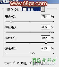 1、打开原图素材,创建可选颜色调整图层,对白色及中性色进行调整,参数设置如图1,2,确定后用黑色画笔把人物部分擦出来,效果如图3。