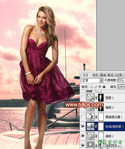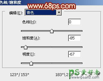 3、创建色相/饱和度调整图层,对青色进行调整,参数设置如图7,确定后把图层不透明度改为:70%,效果如图8。