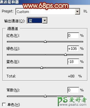 4、创建通道混合器调整图层,对蓝色进行调整,参数设置如图9,效果如图10。