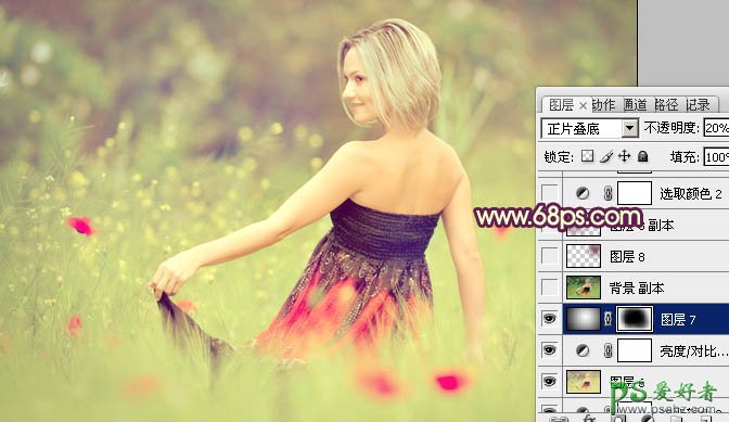 10、新建一个图层,选择渐变工具,颜色设置为黑白,然后由中心向边角拉出白色至黑色径向渐变。确定后把图层混合模式改为“正片叠底”,不透明度改为:20%,加上图层蒙版,用黑色画笔把中间部分擦出来,效果如下图。