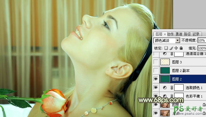 3、新建一个图层,填充颜色:#0D6450,图层混合模式改为“颜色减淡”,不透明度改为:10%,效果如下图。