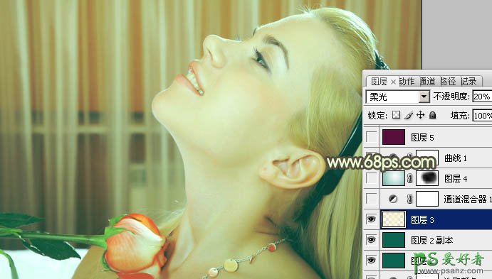 5、按Ctrl + Alt + ~ 调出高光选区,新建一个图层填充颜色:#F9F5CD,图层混合模式改为“柔光”,不透明度改为:20%,效果如下图。