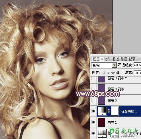 4、创建渐变映射调整图层,颜色设置如图5,确定后把图层混合模式改为“色相”,不透明度改为:60%,效果如图6。