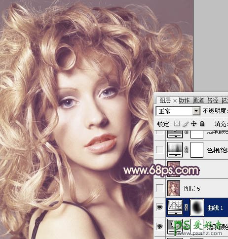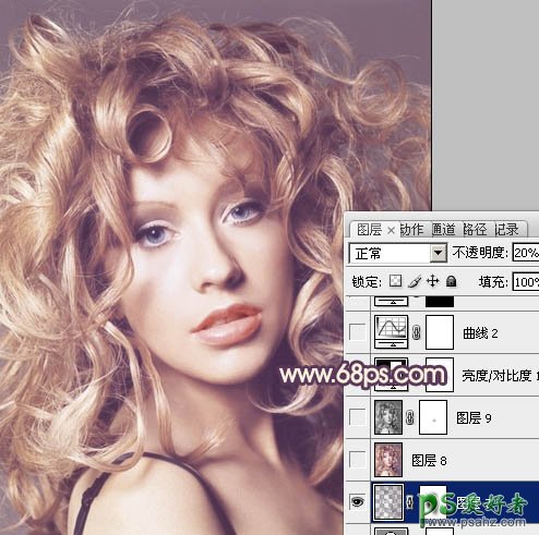 11、按Ctrl + Alt + ~ 调出高光选区,按Ctrl + Shift + I 反选,新建一个图层填充颜色:#573A57,图层不透明度改为:20%,加上图层蒙版,用黑色画笔把人物脸部擦出来,效果如下图。