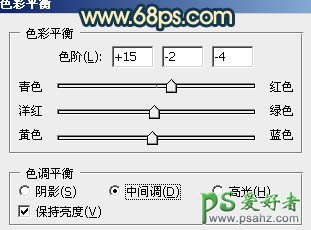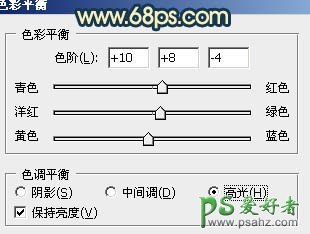 5、创建色彩平衡调整图层,对中间调及高光进行调整,参数设置如图8,9,确定后把蒙版填充黑色,用白色画笔把人物部分擦出来,效果如图10。