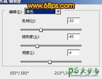 3、创建色相/饱和度调整图层,选择青色,然后用吸管吸取天空部分颜色再调整,参数设置如图6,效果如图7。