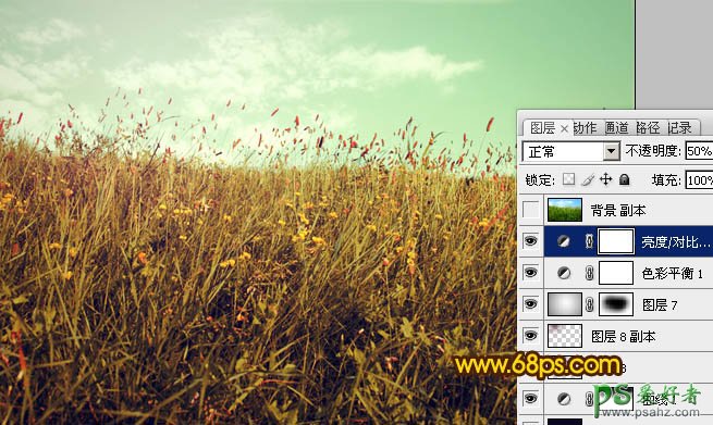 11、创建亮度/对比度调整图层,参数设置如图19,确定后把图层不透明度改为:50%,效果如图20。