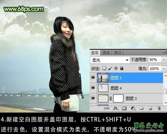 4、新建一个图层,按Ctrl + Alt + Shift + E 盖印图层,按Ctrl + Shift + U 去色,图层混合模式改为“柔光”,不透明度改为:50%,效果如下图。