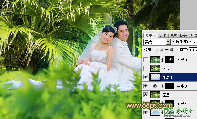 7、新建一个图层,图层混合模式改为“柔光”,把前景颜色设置为:#03ADFC,用画笔把前面的树枝等涂上颜色,再适当调整图层不透明度,效果如下图。