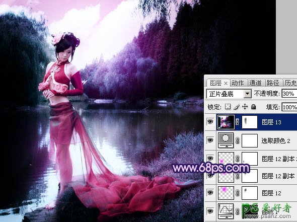 14、新建一个图层,盖印图层。图层混合模式改为“正片叠底”,不透明度改为:30%,加上图层蒙版,用黑色画笔把人物部分擦出来,效果如下图。>