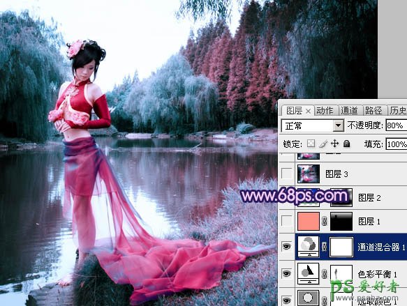 4、新建一个图层填充颜色:#FC9184,图层混合模式改为“正片叠底”,不透明度改为:50%,加上图层蒙版,用黑白渐变拉出底部透明效果。人物部分可以用黑色画笔擦出来,效果如下图。>
