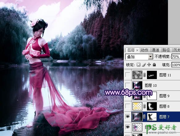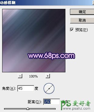 8、新建一个图层,盖印图层,执行:滤镜 > 模糊 > 动感模糊,参数设置如图17,确定后把图层混合模式改为“叠加”,不透明度改为:70%。加上图层蒙版,用黑色画笔把人物部分擦出来,效果如图18。>