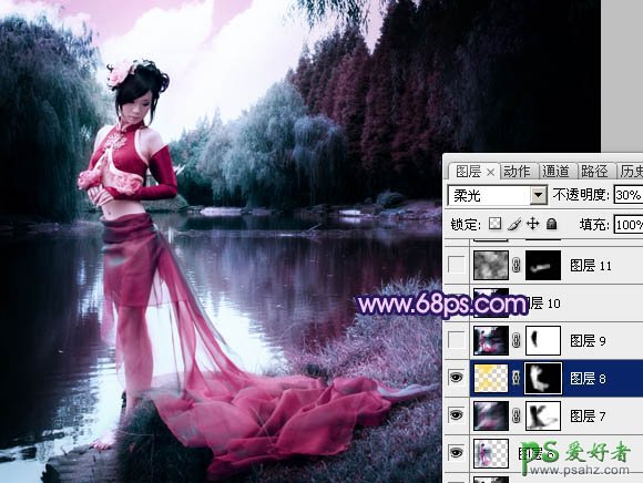 9、按Ctrl + Alt + ~ 调出高光选区,新建一个图层填充颜色:#FBDC4D,图层混合模式改为“柔光”,不透明度改为:30%。加上图层蒙版,用黑色画笔把不需要的部分擦掉,效果如下图。>