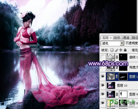 11、新建一个图层,按字母“D”,把前,背景颜色恢复到默认的黑白。执行:滤镜 > 渲染 > 云彩,确定后把图层混合模式改为“滤色”。加上图层蒙版,只保留水面一部分,其它部分用黑色画笔擦掉,效果如下图。>