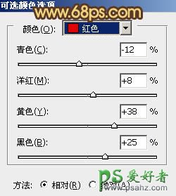 6、创建可选颜色调整图层,对红色进行调整,参数设置如图11,确定后用黑色画笔把人物脸部擦出来,效果如图12。