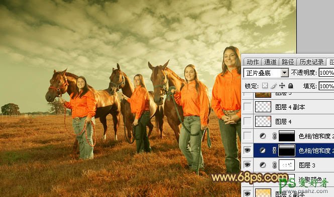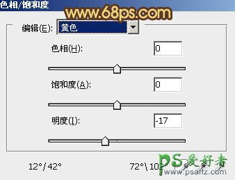 8、创建色相/饱和度调整图层,对黄色进行调整,参数设置如图14,确定后把图层混合模式改为“正片叠底”,选择渐变工具,由上至下拉出白色至黑色线性渐变,效果如图15。