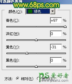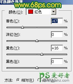 5、创建可选颜色调整图层,对红色及绿色进行调整,参数设置如图13,14,效果如图15。
