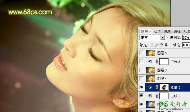 6、按Ctrl + J 把当前曲线调整图层复制一层,图层不透明度改为:80%,用黑色画笔把人物脸部擦出来,效果如下图。