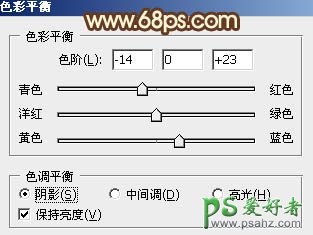 5、创建色彩平衡调整图层,对阴影及高光进行调整,参数设置如图10,11,效果如图12。