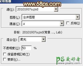 6、新建一个图层,按Ctrl + Alt + Shift + E 盖印图层。选择菜单:图像 > 模式 > Lab颜色,选择不合拼。确定后执行:图像 > 应用图像,参数设置如图13,效果如图14。