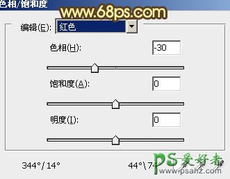 2、创建色相/饱和度调整图层,对红色进行调整,参数设置如图3,确定后用黑色画笔把人物肤色及脸部擦出来,图层不透明度改为:60%,效果如图4。