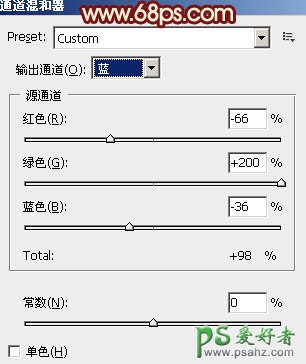 1、打开原图素材,创建通道混合器调整图层,对蓝色进行调整,参数设置如图1,效果如图2。