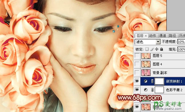 7、创建渐变映射调整图层,颜色设置如图15,确定后把图层混合模式改为“滤色”,不透明度改为:10%,效果如图16。