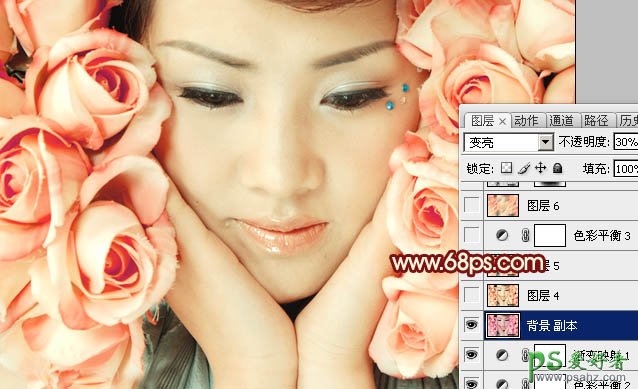 8、把背景图层复制一层,按Ctrl + Shift + ] 置顶,图层混合模式改为“变亮”,不透明度改为:30%,效果如下图。