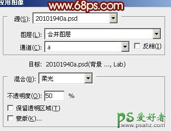 9、新建一个图层,按Ctrl + Shift + Alt + E盖印图层。选择菜单:图像 > 模式 > Lab颜色,选择不合拼。确定后执行:图像 > 应用图像,参数设置如图18,效果如图19。