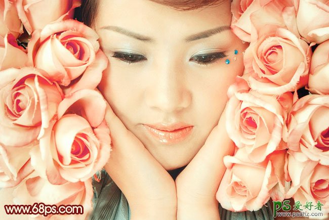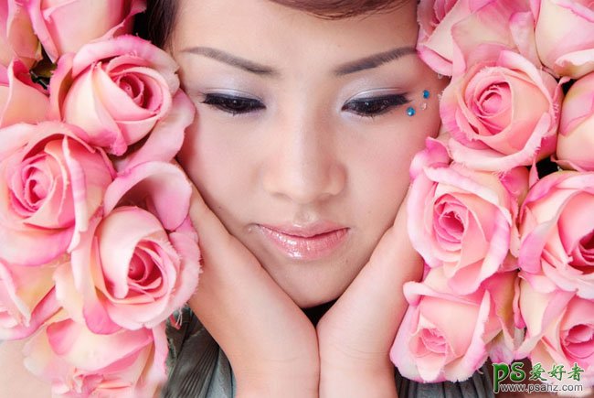 PS美女照片后期调色教程,photoshop调出粉红玫瑰色漂亮美女个人写真照,原图素材主色为紫色调,转为粉红色也很方便,用色相/饱和度或通道混合器等把主色变换一下,再适当加强一下人物肤色的质感和颜色即可。