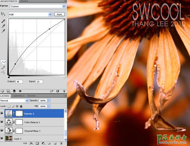 PS照片后期调色教程,photoshop给漂亮的花朵图片调出强对比度金色效果,本教程介绍古典暖色图片调色方法。作者调色以通道混合器调色为主,虽然很少用到,不过调色还是非常快捷的。色彩调好后海需要用滤镜等加上一些简单的杂色,增强图片的古典韵味