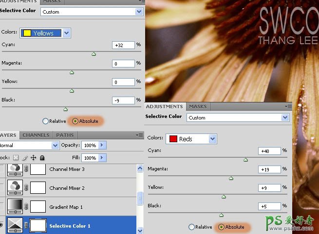 4、创建创建可选颜色调整图层,在绝对模式下对红,黄进行调整,参数及效果如下图。