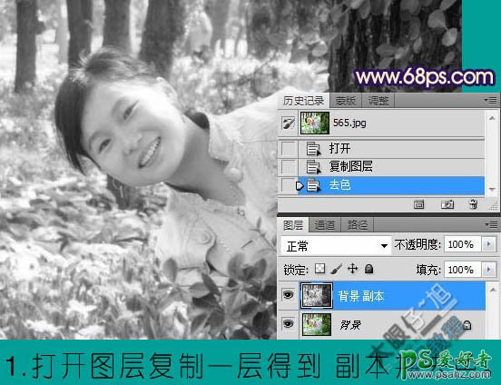 1、打开原图素材,把背景图层复制一层,得到“背景副本”图层,按Ctrl + Shift + U 去色。