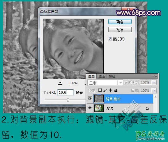 2、对“背景副本”图层执行:滤镜 > 其它 > 高反差保留,数值为10,确定后把图层混合模式改为“叠加”,目的是为了加强照片的对比度。