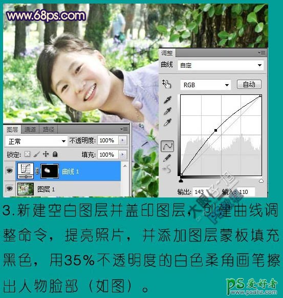 3、新建一个图层,按Ctrl + Alt + Shift + E 盖印图层。创建曲线调整图层,对RGB进行调整,稍微调亮一点。参数设置如下图,确定后把蒙版填充黑色,用透明度为35左右的白色柔角画笔把人物脸部擦出来,如下图。