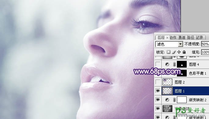 4、按Ctrl + Alt + ~ 调出高光选区,按Ctrl + Shift + I 反选,新建一个图层填充颜色:#4C1A73,图层混合模式改为“滤色”,不透明度改为:50%,效果如下图。